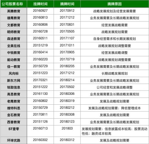 除明星教育股为谋求更好的资本出路外,其他摘牌的新三板教育机构也给出了自己的理由。一个无法忽视的现象是,挂牌公司主动摘牌的理由也愈发直白,“挂不起,融不到”已经成为大部分主动摘牌企业背后共同的声音。