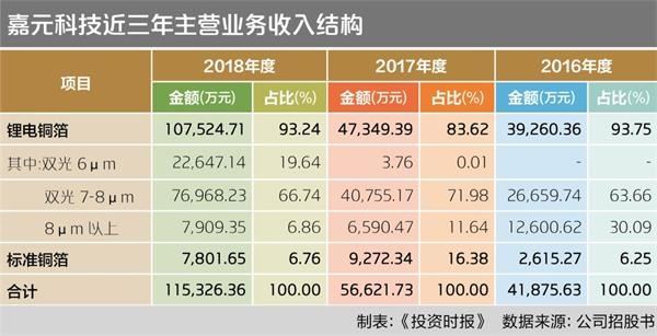 然而,从嘉元科技对外披露的从2016年至2018年的主营业务收入情况看,6μm 高性能极薄锂电铜箔产品还并不是公司的主要收入来源,近几年一直为公司贡献绝大多数营收的还是双光7-8μm的锂电铜箔产品。