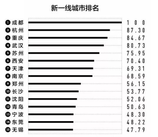 而15个“新一线”城市排名前三位的分别为成都(100)、杭州(87.30)、重庆(84.67)。其中:成都、杭州连续三年占据新一线头两位;重庆、苏州和郑州市位次连续3年上升的3个城市;无锡经过了一年的蛰伏重返新一线,而大连被挤出名单,跌落至昆明之后的第21位;大连跌出名单,反映出东北城市的持续衰落,沈阳虽然还在榜,但也下滑了1位。