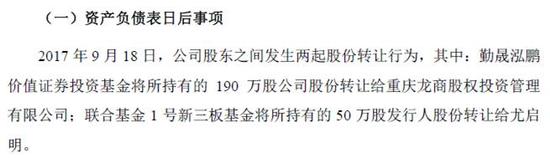 招股说明书显示,2017年9月18日,勤晟泓鹏将其持有的190万股博拉网络的股权转让给重庆龙商股权投资管理有限公司,联合基金1号新三板基金将其持有的50万股博拉网络的股权转让给尤启明。