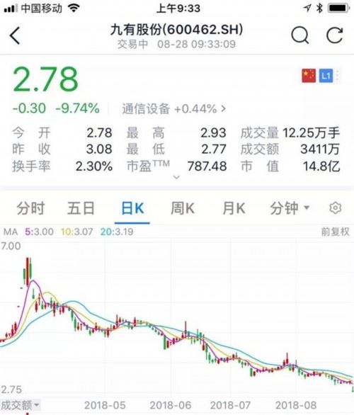 自春晓资本入主以来,九有股份的股价也伴随大市情况一路走低,目前最新价2.8元左右,相比于2017年9月的阶段性最高点6.59元/股大幅下跌。