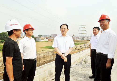 图为省人大常委会副主任、市委书记李俊明在雄忻高铁引入大西客专道岔施工现场调研。本报记者 刘纪森 摄