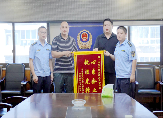 7月24日,冷水江市市场监督管理局收到了一面写有“心系企业 执法先锋”的锦旗。这面锦旗是贵州养森大健康有限公司派人专程送来的,以表达对冷水江市市场监督管理局维护企业合法权益的感激之情。