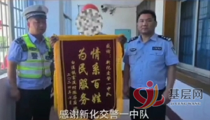 8月4日,新化县白溪镇陈先生将一面写着“情系百姓,为民服务”八个大字的锦旗送到了新化县公安局交警大队,他对新化公安交警开道护送老人到医院,为其亲人及时送医争取宝贵时间表示由衷的感谢!“你们是人民好交警“!陈先生说。
