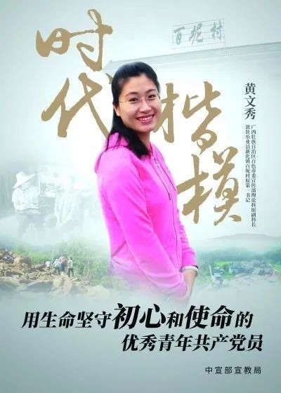 黄文秀(1989-2019),女,壮族,广西田阳人。2011年6月加入中国共产党。2016年从北京师范大学研究生毕业后,定向选调至百色市委宣传部工作。2018年3月,积极响应组织号召,到乐业县百坭村担任驻村第一书记,埋头苦干,带领群众发展砂糖橘、八角、杉木等种植产业,带动88户418名贫困群众脱贫,全村贫困发生率下降20%以上。2019年6月17日凌晨,在从百色返回乐业途中遭遇山洪不幸遇难。被追授“时代楷模”“全国三八红旗手”“全国优秀共产党员”称号。
