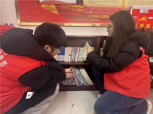 (图为实践团成员为社区整理图书的图片)