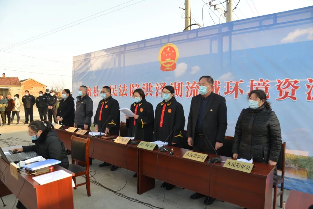 12月4日下午,在国家宪法日当天,为弘扬宪法精神,进一步彰显司法保护生态环境资源的力度,盱眙法院洪泽湖流域环境资源法庭联合江苏省洪泽湖渔业管理委员会、宿迁市检察院、泗洪县检察院等单位共同开展了“共抓大保护、不搞大开发”巡回审判活动,在洪泽湖畔的泗洪县界集镇周咀村公开开庭审理了一起13名被告人的非法捕捞水产品案。