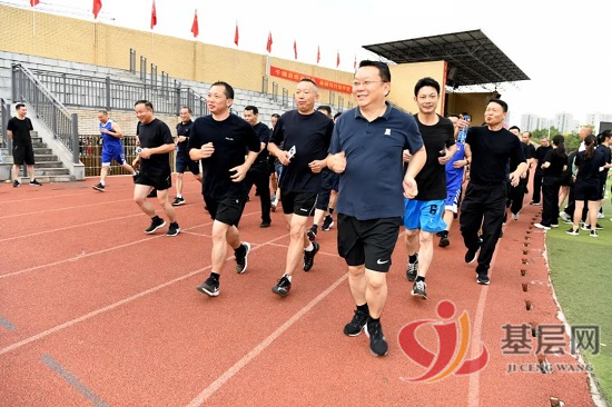 图为局党委副书记、政委孙红辉(前一) 带队的男子组1000米跑步。