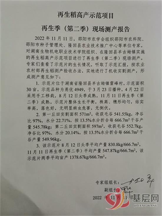 中国基层网11月11日讯11月11日,从湖南省隆回县羊古坳镇雷峰村再生稻高产示范基地传出喜讯:该基地“甬优4949”再生稻(第二季)经专家现场测产,每亩平均产量549.96公斤,加头季每亩平均产量830.8公斤,两季每亩平均产量1378.67公斤,创湖南省再生稻最高产量纪录。