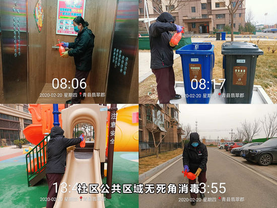 “消杀中场”保洁员:小林小杨保洁人员,每天数次全方位无死角消毒,公共区域、游乐设施、甚至社区路面都坚持每天多次消杀,垃圾箱及时清运并消毒。
