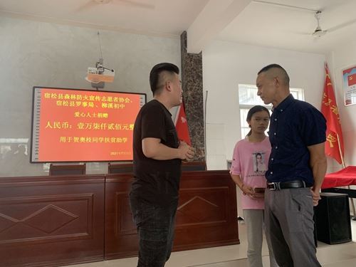安徽宿松讯(文/图/陈达全/责编/韩同瑞)2021年7月1日,宿松县森林防火宣传志愿者协会和宿松县罗事局自媒体平台的爱心人士,冒雨来到柳溪初中,将募集到的17720元的爱心善款送到该校就读的孤儿贺奥枝手中,用于该生扶贫助学。