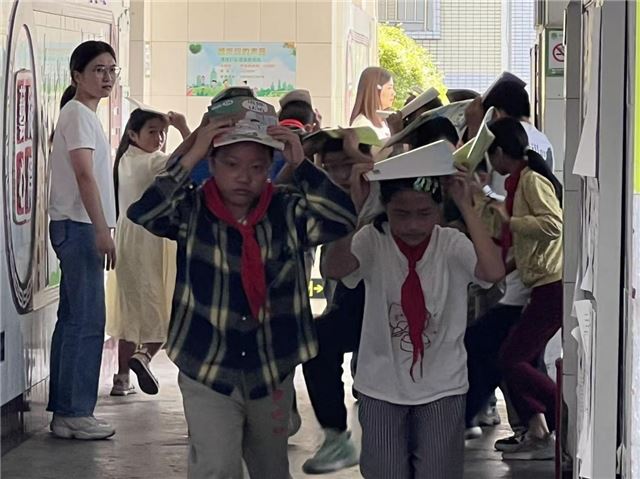 预警信号响起的瞬间,教室里的学生们迅速反应,按照平日所学的避震知识,双手抱头、弯腰低姿,快速躲到课桌下方等安全区域,进行紧急避震,整个过程规范有序,展现出良好的应急素养。待避震环节结束,疏散信号发出后,各班教师立即组织学生按照预定疏散路线,弯腰护头、快步前行,在确保安全的前提下,迅速向操场指定集合点疏散。从预警信号响起到全体学生安全抵达操场,全程仅用1分12秒,充分体现了演练的高效性与学生们的应急反应能力。