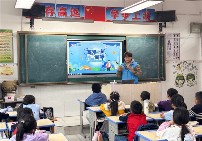 活动首日,宣讲团以理论知识讲解为核心,为石鼻镇小学的同学们带来了一场生动鲜活的 “两弹一星” 精神专题课。用孩子们易于理解的语言,从 “两弹一星” 工程的历史背景切入,细致讲述了在新中国成立初期,面对复杂的国际环境,我国科研工作者在戈壁荒滩上隐姓埋名、艰苦奋斗,成功研制出原子弹、氢弹和人造卫星的光辉历程。宣讲团成员通过讲述钱学森、邓稼先等科学家的感人事迹,让孩子们认识到了两弹一星的精神内涵。