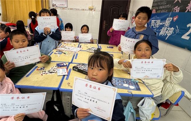 活动最后,为鼓励孩子们主动学习、积极传播 “两弹一星” 精神,宣讲团成员们不仅为孩子们准备了拼图玩具,文具用品,纪念徽章等一系列的精美礼品,还特别为参与活动的孩子们颁发了 “小小宣讲员” 荣誉证书,宣讲团成员逐一走到孩子们面前,双手将印有 “小小宣讲员” 字样的荣誉证书递到他们手中,拿到证书的孩子们兴奋地和身边同学分享喜悦,脸上洋溢着自豪的笑容。这张小小的证书,不仅是对孩子们两天来表现的肯定,更在他们心中种下了传承的种子,让他们意识到自己也能成为红色精神的传播者,让红色精神在代代相传中焕发新的活力。