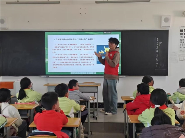 课堂上,志愿者以生动形象的语言向同学们介绍了石油和天然气的运输方式,重点讲解了管道运输作为“超级高速公路”的安全高效优势。同时,志愿者明确列出了六大危险行为,包括擅自开关管道阀门、损坏管道设施、移动管道标志、在管道周边重型车辆通行、嬉戏玩耍及违规施工等,通过案例讲解强调这些行为的危害性以及带来的不好的法律后果,以此告诉同学们要养成良好的管道安全意识。