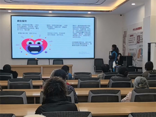 如果说街头宣传是“广撒网”,那么在社区服务站举办的专题讲座则是“深耕耘”。活动现场座无虚席,实践团成员借助多媒体设备,为小吴村的老人们带来了一场系统、深入的反诈知识盛宴。