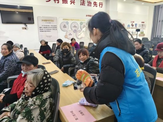 图为实践团成员给老人们分发手套刘惠供图