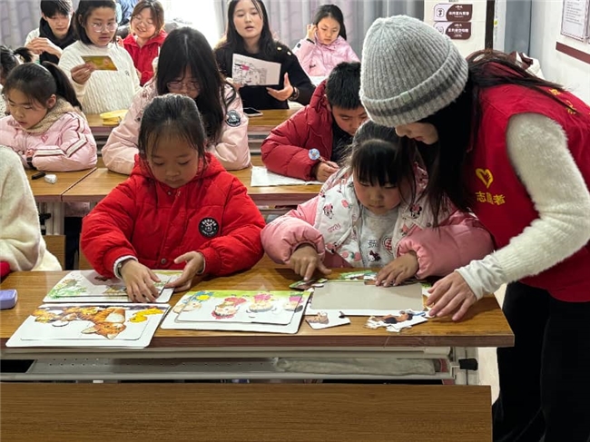 下午的趣味活动同样精彩。志愿者们设计了“数字拼图大挑战”“几何图形变变变”等数学游戏,孩子们在欢声笑语中锻炼逻辑思维。在“冬日暖心手工课”上,大家用彩纸制作新年贺卡,稚嫩的笔触里满是对家人的真情祝福。这些活动不仅丰富了孩子们的假期生活,更搭建起大学生与社区儿童之间的温暖桥梁。