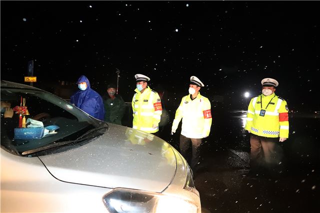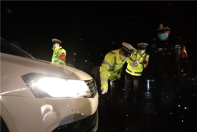 当晚,山西运城市下起了鹅毛大雪,风雪夜正遇上疫情防控关键时期,盐湖公安交警从领导到一线中队民警,上下团结,众志成城,坚守在防控疫情一线,他们积极配合卫健部门冒着鹅毛大雪,按照防控程序,逐人逐车进行严密排查,坚决打赢疫情防控阻击战。