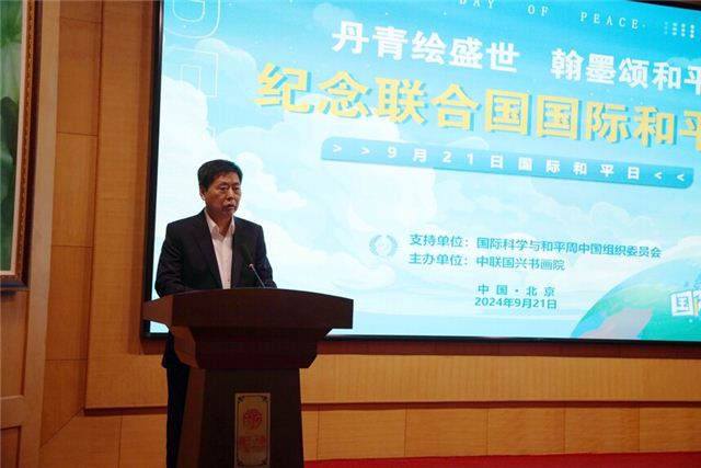 2024年9月21日,为庆祝联合国国际和平日,弘扬中华优秀传统文化,传递中华民族的和平文化理念,由国际科学与和平周中国组织委员会支持,北京中联国兴书画院主办的以“丹青绘盛世 翰墨颂和平”为主题的纪念联合国国际和平日活动在京举办。中联部原副部长、中国人民争取和平与裁军协会顾问马文普,全国政协常委、教科文卫体委员会副主任、中国科技新闻学会理事长徐延豪,中华全国工商业联合会原副主席王治国,中国社会工作联合会党委书记、副会长周惠,中社社会工作发展基金会理事长赵蓬奇,国际科学与和平周中国组委会秘书长陈一雄,中国社会工作联合会执行秘书长王欣,联合国教科文组织驻华办公室教育项目专员于滨,北京中联国兴书画院执行院长徐磊,副院长吴明等领导和中联国兴书画院的将军书画家,首都书画艺术家代表以及北京育英学校、首师大附中第一分校等学校的中小学生共计70余人共聚一堂,以书画艺术为载体,展现中国文化的魅力,共同纪念这一具有历史意义的日子。纪念活动由原中国人民解放军总装备部宣传部副部长刘江海主持。
