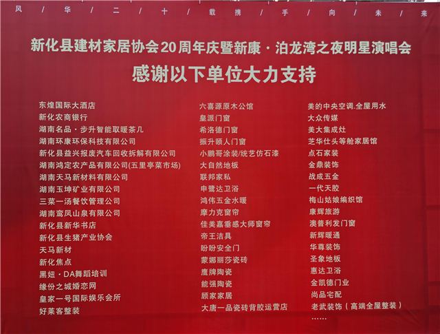 11月2日,新化县建材家居协会20周年庆暨“新康·泊龙湾之夜”大型明星演唱会在新化体育馆隆重举行,场面异常火爆,县领导杨铁贞、 罗忠庆、陈永松 、彭景璟、 彭盛 等出席庆祝活动。