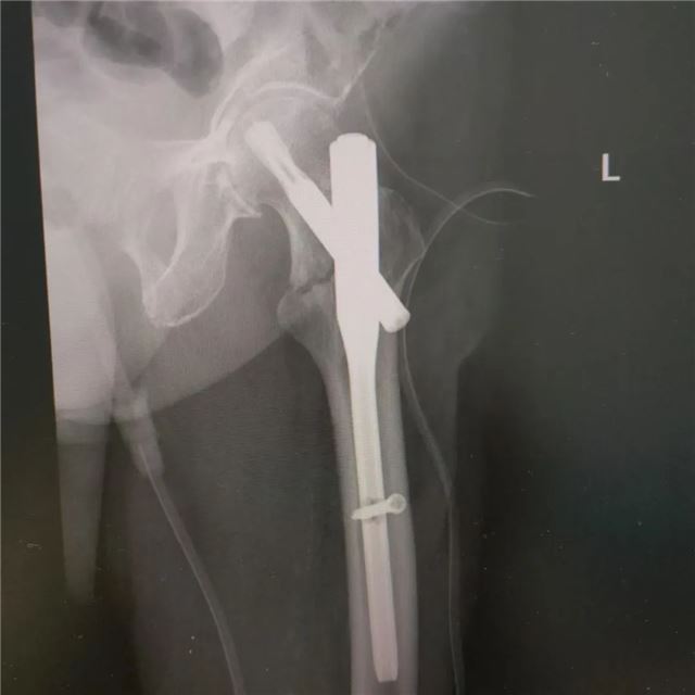 一位102岁的超高龄患者,在家中不慎摔倒,造成左侧股骨粗隆间粉碎性骨折(髋关节部位骨折),髋关节疼痛、活动受限不适,无法负重、站立行走。这是一场对生命的严峻考验。