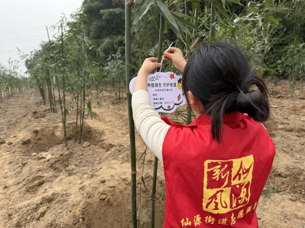 经过共同努力,十余棵竹子在土地上“扎根落户”,一阵微风拂过,竹叶随风摆动,摇曳生姿。之后,社区工作人员和老师们用彩笔在树牌上写上了对竹子的祝福和环保标语,“愿你茁壮成长,为地球添一抹绿!”“种植绿色,守护希望!”等话语,寄托对竹子的美好期许和对环保的坚定承诺。