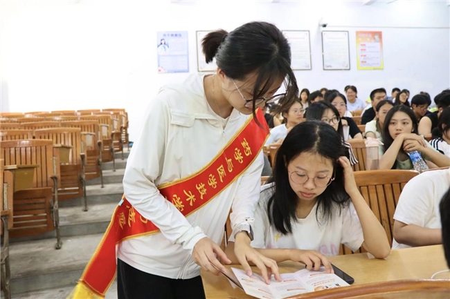 图为志愿者为新生讲解资助政策 黄雪欣 摄
