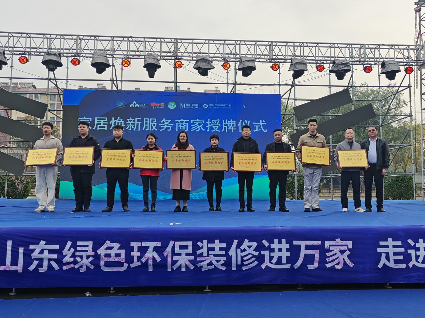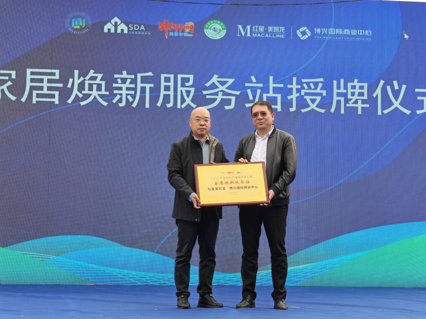 活动现场,授牌仪式环节亮点十足。山东省装饰协会党支部副书记/国有资产监事杨永军为红星美凯龙·博兴国际商业中心颁发“家居焕新服务站”铜牌,标志着双方携手搭建的家居服务新阵地正式落地。与此同时,十家“家居焕新服务商家”同步授牌,共同组成服务站的优质服务矩阵。
