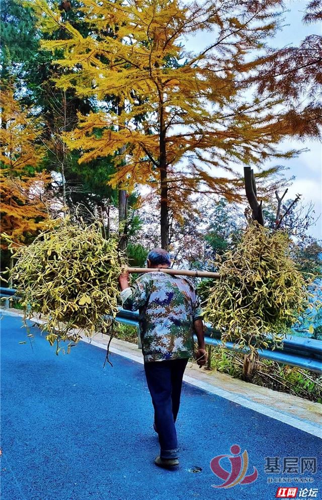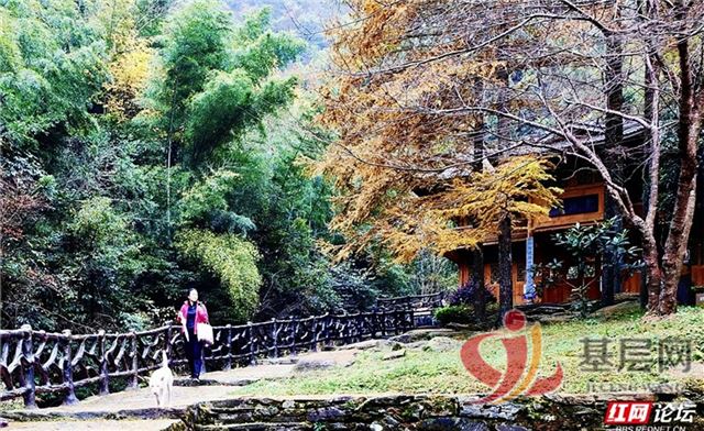 山是活的。高大树木织成浓荫穹顶,枝桠间漏下的光斑,在红棕色屋顶的木屋上跳着步,也在茅草顶的建筑前积成一片暖黄。石板径、柏油路、木栅栏,沿着山势蜿蜒,像大地的脉络——有人扛着柴禾走过,迷彩服沾着草木香;挑担的老人,脚步沉稳,将山野的馈赠稳稳驮向烟火处。