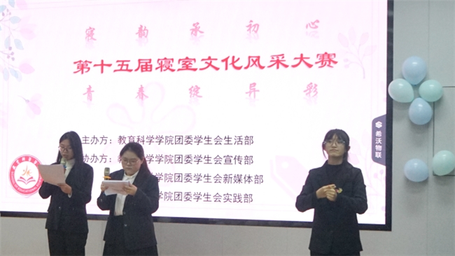 为深化寝室文化建设,营造温馨和谐、积极向上的育人环境,落实学校“三全育人”“五育并举”理念,12月7日,教育科学学院在砺志楼T2222举行第十五届寝室文化风采大赛决赛。本次活动由教育科学学院团委书记杨逐与学生代表担任评委,郑善晨、张佳琪主持,百余名同学到场观摩。