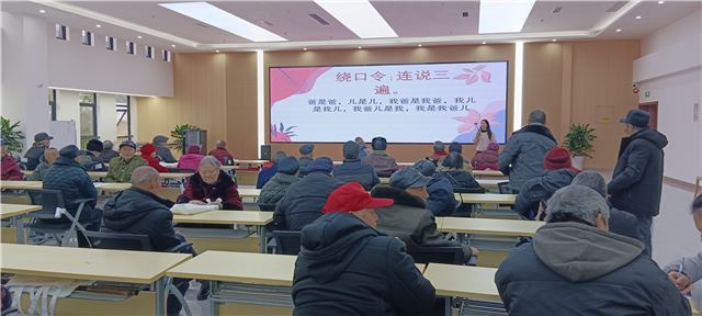 理论分享后,两场趣味互动环节将活动气氛推向高潮。在“抢水瓶大战”中,老人们全神贯注紧盯目标,随着指令迅速行动,反应敏捷不输年轻人,现场笑声此起彼伏;“绕口令大赛”上,老人们鼓足干劲挑战经典段子,从“四是四,十是十”到更复杂的趣味绕口令,即便偶尔卡顿也即刻调整状态,展现出不服老的精神风貌。互动不仅锻炼了老人们的反应能力与语言表达能力,更打破了沉默隔阂,增进了彼此间的交流。