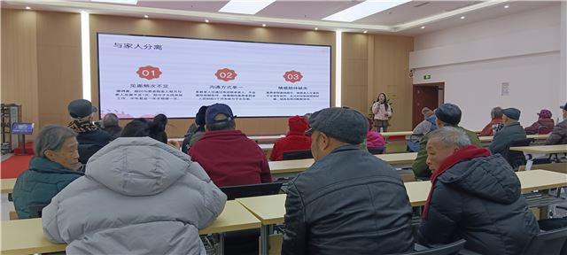 活动伊始,主讲人温雪莲结合老年人心理特点,用通俗易懂的语言解析了孤独感的产生根源:从家庭结构变化导致的情感陪伴缺失,到年龄增长带来的社交圈子缩小,再到退休后社会角色转变引发的自我价值迷茫等,让老人们对自身情绪有了更清晰的认知。针对这些问题,主讲人进一步分享了简单易行的心理调节方法,包括主动参与集体活动、培养兴趣爱好、积极自我暗示等,为老人们提供了应对负面情绪的“心理良方”。