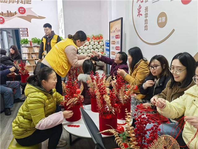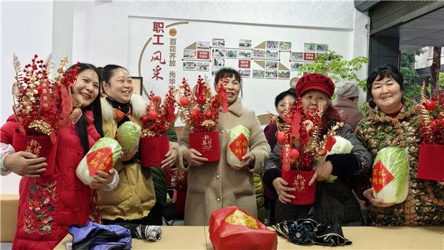 在新春福气“抱抱桶”制作环节,工作人员提前布置好场地,展示成品并讲解制作技巧。工会成员们热情高涨,纷纷动手参与,将红色浆果、金色叶片等材料巧妙搭配,制作出一个个饱含新春祝福的“抱抱桶”。现场欢声笑语不断,大家相互交流与帮助,彼此欣赏和鼓励,在动手实践中感受到节日的欢乐。
