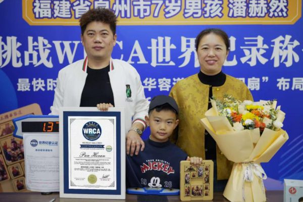 2026年2月6日,泉州7岁男孩潘赫然,在泉州WRCA世界纪录官方认证的挑战现场,迎来了万众瞩目的高光时刻——在WRCA益智类项目认证官50项世界纪录获得者叶佳希老师、中明大魔方大湾区负责人陈伟老师、中国魔方一级裁判员黄玉梅老师等专业团队的共同见证下,他使用魔域文化三国华容道,以1.37秒的极致速度,大幅度打破最快时间盲解4×5华容道“诸葛羽扇”布局的WRCA世界纪录!