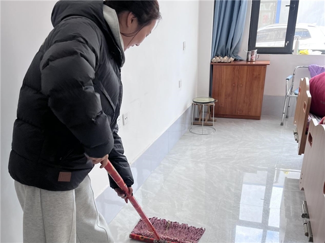 随后,实践团成员对室内公共区域进行清洁整理。成员手持工具擦拭地面、清理角落杂物,对走廊与房间地面逐一清扫,确保环境干净安全。整个过程中,成员保持安静有序,不影响老人正常休息,专注完成各项服务工作。