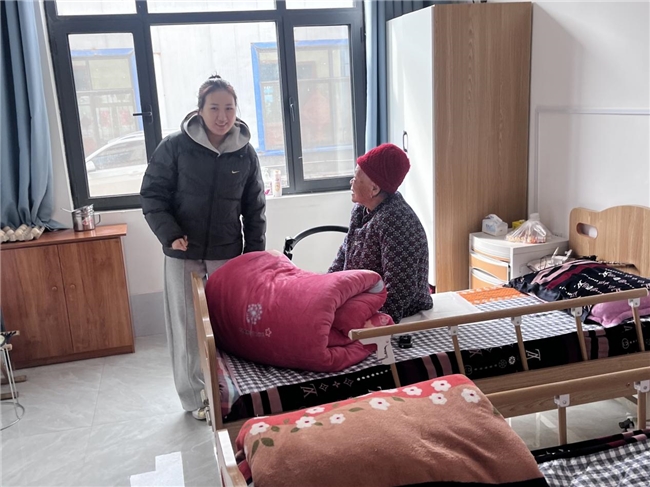实践团成员抵达敬老院后,在工作人员指引下进入老人居住区域。成员依次走进房间,帮助老人整理床铺、折叠被褥、归置衣物和生活用品。他们动作轻缓,根据老人日常习惯摆放物品,让居室更加整洁有序。部分老人行动不便,成员耐心协助调整坐姿,细心关注老人状态。
