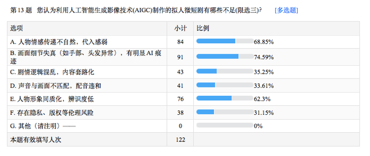 AIGC技术作为微短剧行业的新兴发展方向,其应用价值已被广泛感知,同时也存在亟待突破的技术痛点。74.59%的受访者认为其存在“画面细节失真,有明显AI痕迹”,68.85%指出“人物情感传递不自然,代入感弱”,人物形象同质化、配音违和等问题也备受诟病。