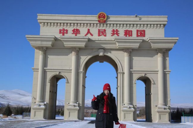 图为实践队成员在阿尔山国门前,感受祖国边疆的庄严与辽阔,厚植家国情怀。冯阿迪雅 供图