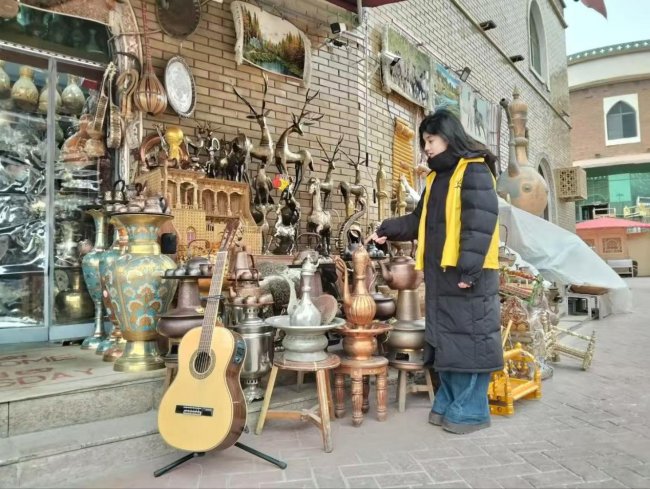 图为实践队成员在喀什古城手工艺品店驻足观赏,在触摸西域技艺的温度中,凝聚起华夏民族一家亲的深厚情感。古丽孜巴 供图