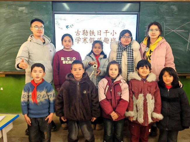 图为实践队成员与古勒铁日干小学师生合影留念,定格支教路上的温暖瞬间。热依汉古丽·图尔荪托合提 供图