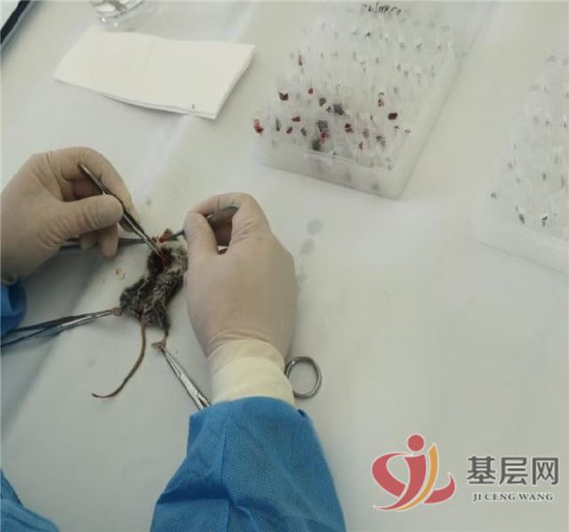 对野外捕获的鼠类样本,工作人员严格按照生物安全操作规范处理,统一带回实验室后,规范采集肺、肝、脾、肾等组织标本样本并及时送检,重点开展汉坦病毒、巴尔通体等鼠传高风险病原体检测,系统分析鼠类病原携带率与感染特征,为科学评估辖区鼠传疾病传播风险提供精准数据支撑。