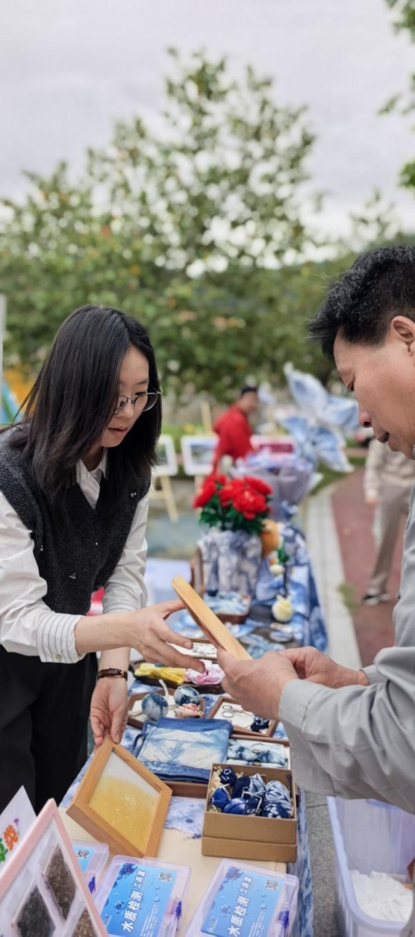 舞台之外,文化科技展示区同样吸睛。展览围绕“乡愁、古韵、风物、红脉”立体呈现侨乡文脉;关工委“五老”驻点讲述美食技艺传承;“科技助农·科技强产”专区通过生动的图文、教具配合讲解展陈特派员制度成效;一侧的扎染工艺成品更吸引众多游客驻足。传统技艺与现代科技在此完美交融。