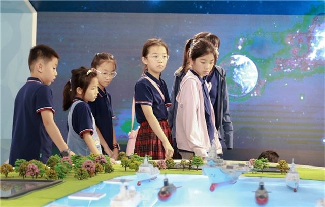 该展区以图文模型和多媒体技术展现了新中国成立以来国防建设的伟大成就。孩子们在“两弹一星”展台前驻足,通过屏幕互动了解科学家们的奋斗故事;在航母模型旁,大家兴奋的聆听讲解员讲解现代海军的发展。有孩子感叹道:“现在我们的国防科技可真厉害啊!”,通过展示国家从弱到强的历程,增强了孩子们的民族自豪感与使命感。