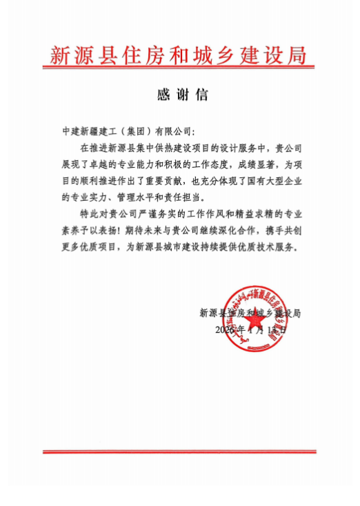 其中,针对新源县集中供热建设项目,新源县住房和城乡建设局专门致信致谢。信中高度肯定了中建新疆建工设计分公司在项目设计服务全过程中的专业担当与卓越表现,指出公司在项目推进过程中,始终秉持严谨务实的工作作风,凭借精益求精的专业素养和积极主动的服务态度,高效推进各项设计工作,为项目顺利实施提供了坚实技术支撑,作出了重要贡献,充分彰显了国有企业过硬的专业实力、高效的管理水平和强烈的责任担当。信函同时表达了深化合作的殷切期待,希望未来与公司继续携手共进,打造更多优质精品工程,持续为新源县城市建设高质量发展提供专业、高效的技术服务支撑。(通讯员 杨俊杰)