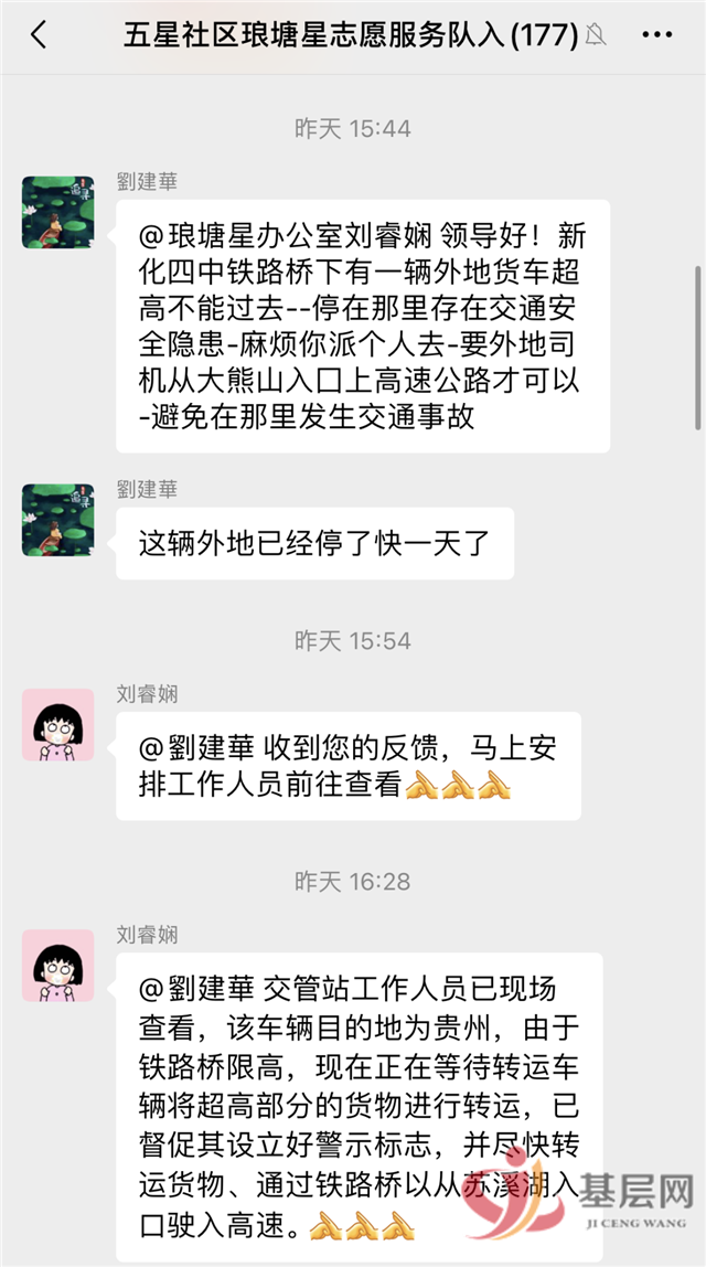 8月19日下午3点44分,五星社区的志愿者刘建华发现新化四中铁路桥下有一辆外地货车超高不能过去,停在路旁存在安全隐患,他立马向镇政府反映情况。