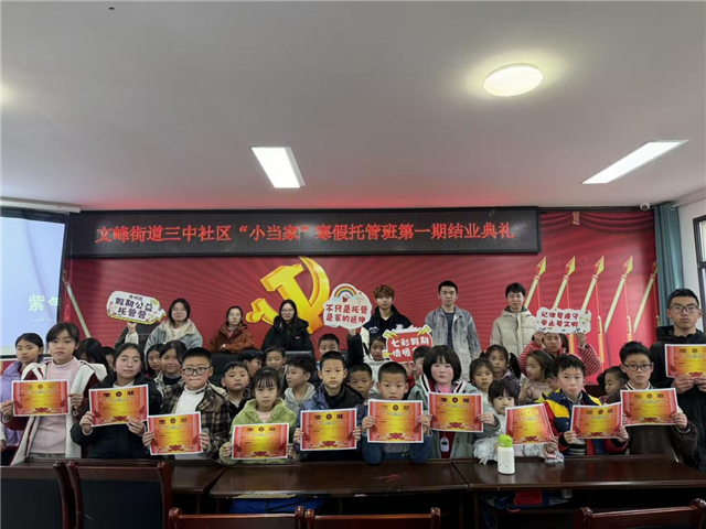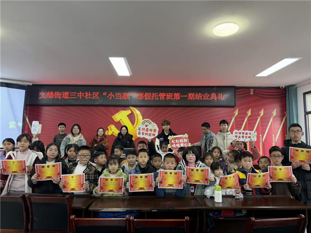 2月6日,文峰街道三中社区“小当家”托管班第一期结业典礼在社区活动室温情启幕。社区工作人员、大学生志愿者、全体学员齐聚一堂,共同见证孩子们的成长蜕变,为这段充实的托管时光画上圆满句号。