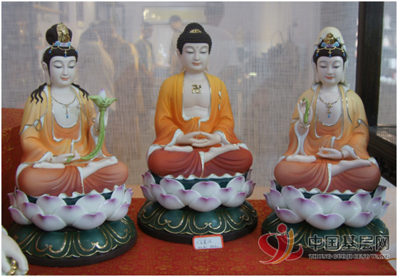 郭桂星介绍,西方三圣又称弥陀三尊,指的是西方极乐世界三尊主要的佛菩萨,即教主阿弥陀佛和他的左胁侍观世音菩萨、右胁侍大势至菩萨。造像上,三者皆在莲座上,莲象征出淤泥而不染,于一真法界而能应化在十法界;阿弥陀佛居中,观音菩萨胁侍在左,大势至菩萨胁侍在右。三者塑像或画像为修行净土宗者礼敬的对象。