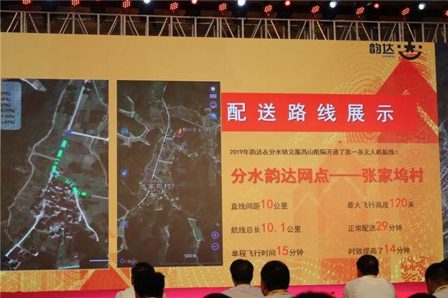 2019年至今,韵达在桐庐开通了第一条常态化运行的农村快递配送无人机航线,主要是韵达分水镇网点到张家坞村的线路,线路的直线间距约10公里,最大飞行高度120米,飞行速度约15米每秒。