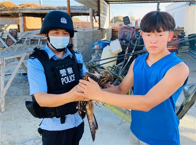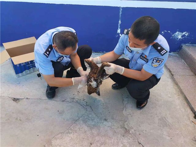 【通讯员杨志川】8月25日,新疆阿勒泰边境管理支队齐巴尔边境派出所民警接到辖区喀拉塔勒村马某报警:“我家院内发现一只大鹰好像受伤了,我们也不知道这是什么鸟,请派出所民警过来看一下。”